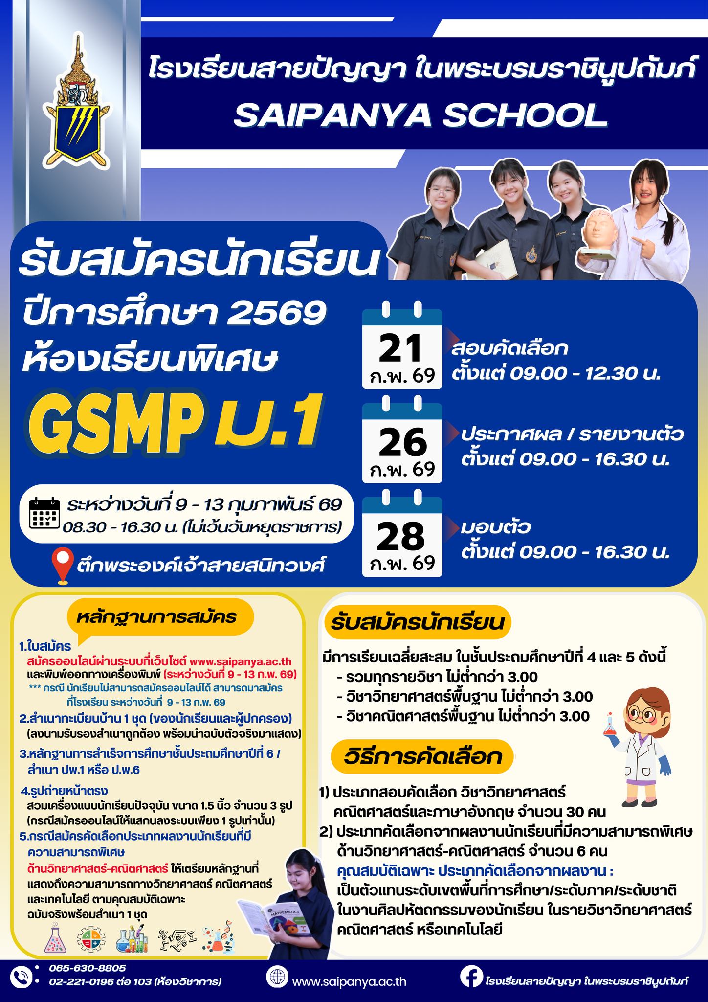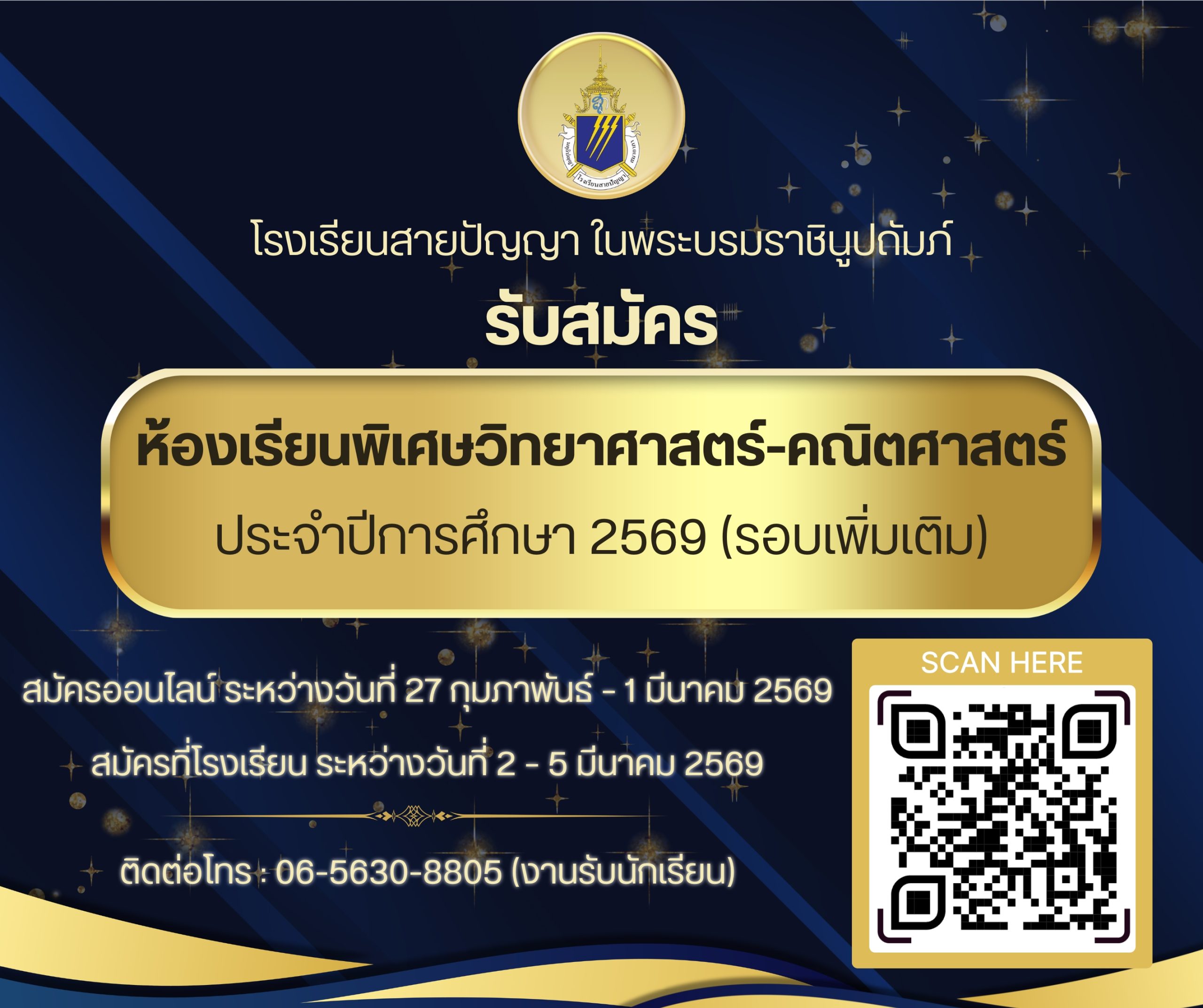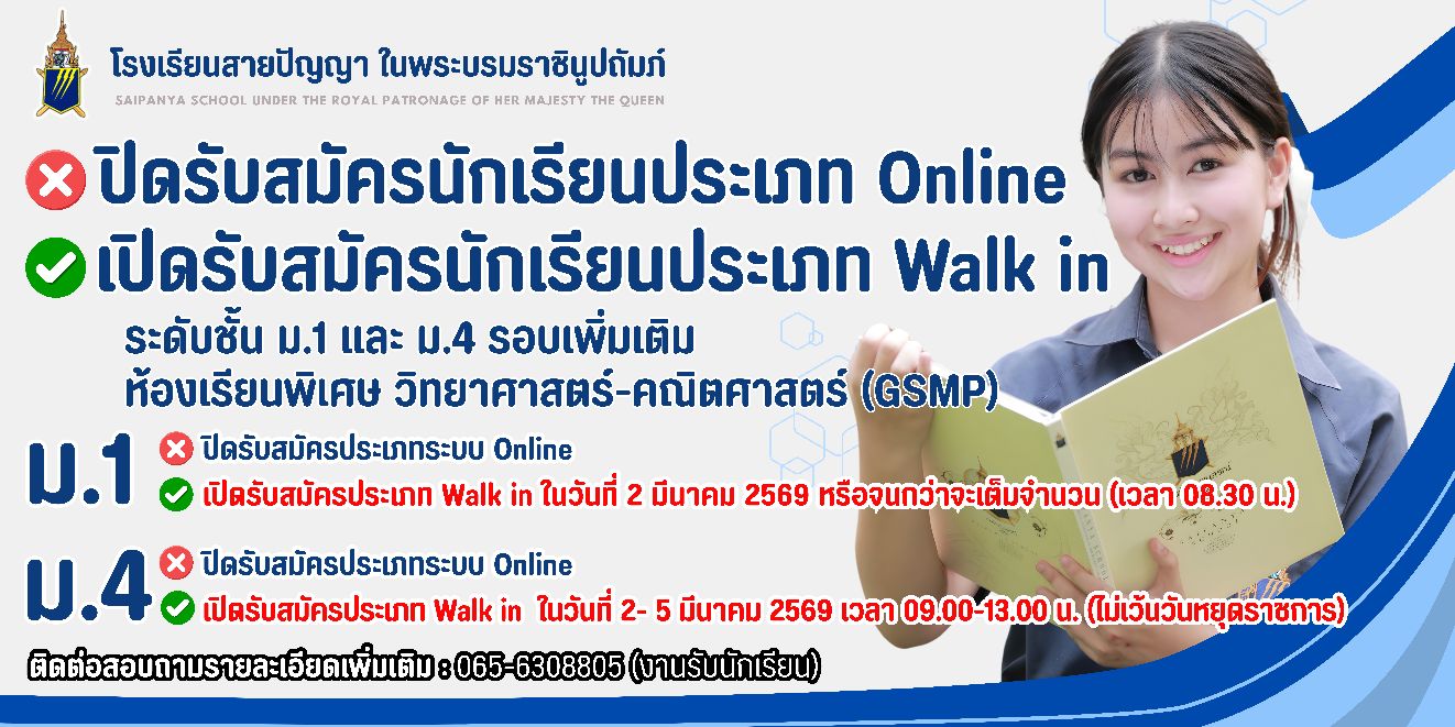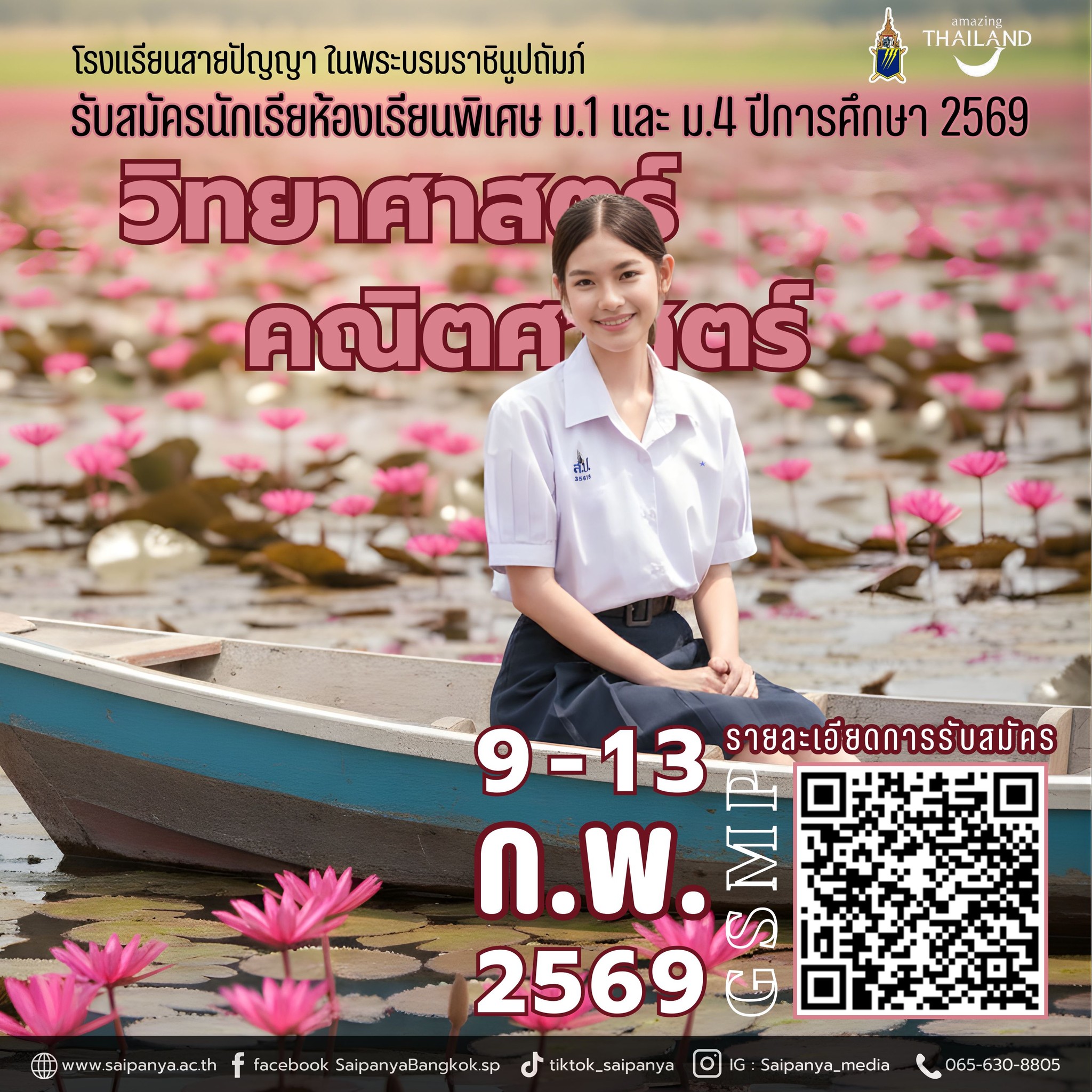 หน้าแรก ประกาศรายชื่อนักเรียนที่มีสิทธิ์สอบคัดเลือกเข้าศึกษาต่อในระดับชั้น ม.1 และ ม.4 ประเภทห้องเรียนพิเศษวิทยาศาสตร์ คณิตศาสตร์ (GSMP) เพิ่มเติม – รายนักเรียนที่มีสิทธิ์สอบคัดเลือกเข้าศึกษาต่อในระดับชั้นมัธยมศึกษาปีที่ 1 ปีการศึกษา 2569 ประเภทห้องเรียนพิเศษวิทยาศาสตร์ คณิตศาสตร์ (GSMP) เพิ่มเติม– รายนักเรียนที่มีสิทธิ์สอบคัดเลือกเข้าศึกษาต่อในระดับชั้นมัธยมศึกษาปีที่ 4 ปีการศึกษา 2569 ประเภทห้องเรียนพิเศษวิทยาศาสตร์ คณิตศาสตร์ (GSMP) เพิ่มเติม การรับสมัครนักเรียนห้องเรียนพิเศษวิทยาศาสตร์ คณิตศาสตร์ (GSMP) ม.1 และ ม.4 ปีการศึกษา 2569 เพิ่มเติม ประกาศผลการสอบคัดเลือกเข้าศึกษาต่อประเภทห้องเรียนพิเศษวิทยาศาสตร์ คณิตศาสตร์ (GSMP) – ประกาศผลการสอบคัดเลือกนักเรียนเข้าศึกษาต่อชั้นมัธยมศึกษาปีที่ 1 ปีการศึกษา 2569 ประเภทห้องเรียนพิเศษวิทยาศาสตร์ คณิตศาสตร์ (GSMP)– ประกาศผลการสอบคัดเลือกนักเรียนเข้าศึกษาต่อชั้นมัธยมศึกษาปีที่ 4 ปีการศึกษา 2569 ประเภทห้องเรียนพิเศษวิทยาศาสตร์ คณิตศาสตร์ (GSMP) การรับนักเรียนเข้าศึกษาต่อประเภทห้องเรียนวิทยาศาสตร์ คณิตศาสตร์ (GSMP) – ประกาศรายชื่อผู้มีสิทธิ์สอบคัดเลือกเข้าศึกษาต่อระดับชั้น ม.1 และ ม.4 ประเภทห้องเรียนวิทยาศาสตร์ คณิตศาสตร์– ระบบรับสมัครนักเรียนห้องเรียนพิเศษ (GSMP) ม.1 และ ม.4– ประกาศรับนักเรียนเข้าศึกษาต่อมัธยมศึกษาปีที่ 1 ประเภทห้องเรียนวิทยาศาสตร์ คณิตศาสตร์ (GSMP)– ประกาศรับนักเรียนเข้าศึกษาต่อมัธยมศึกษาปีที่ 4 ประเภทห้องเรียนวิทยาศาสตร์ คณิตศาสตร์ (GSMP) ประกาศรับสมัครนักเรียนเข้าศึกษาต่อชั้นมัธยมศึกษาปีที่ 1 ปีการศึกษา 2569 ประกาศรับสมัครนักเรียนเข้าศึกษาต่อชั้นมัธยมศึกษาปีที่ 4 ปีการศึกษา 2569 ประกาศรายชื่อผู้มีสิทธิ์สอบคัดเลือกเข้าศึกษาต่อระดับชั้น ม.1 และ ม.4 ประเภทห้องเรียนวิทยาศาสตร์ คณิตศาสตร์ ระบบรับสมัครนักเรียนปีการศึกษา 2569 ประกาศรับสมัครร้านค้าจำหน่ายอาหารในโรงเรียน กิจกรรมภายในวังเจ้าสาย ข่าวรับสมัครงาน 8 มกราคม 2024 ประกาศรับสมัครลูกจ้างชั่วคราว ตำแหน่งครูอัตราจ้าง ประกาศแจ้งจากโรงเรียน ประกาศรับสมัครนักเรียนเข้าศึกษาต่อ20 กุมภาพันธ์ 2025 ข่าวจัดซื้อจัดจ้าง ประกาศรับสมัครร้านค้าจำหน่ายอาหารโรงรียน28 กุมภาพันธ์ 2025ข่าวจัดซื้อจัดจ้าง ปฏิทินปฏิบัตงานโรงเรียน การเปิดเผยข้อมูลสาธารณะ ITA โรงเรียนสายปัญญา ในพระบรมราชินูปถัมภ์ กิจกรรมของโครงการห้องเรียนพิเศษ ความภาคภูมิใจของโรงเรียนสายปัญญา ในพระบรมราชินูปถัมภ์ แนะนำโรงเรียนสายปัญญา ในพระบรมราชินูปถัมภ์ โรงพยาบาลศิริราช ปิยมหาราชการุณย์ ไ