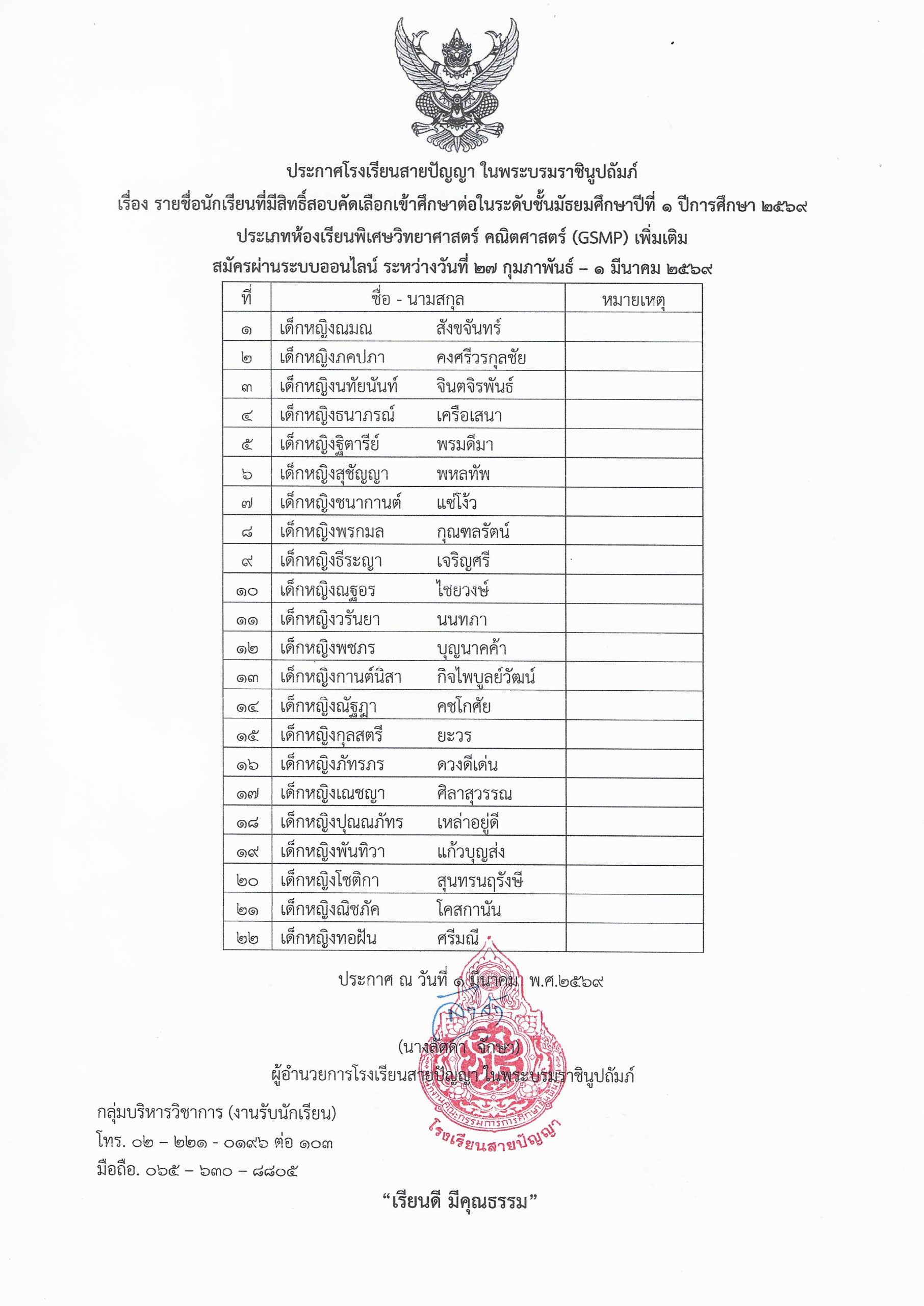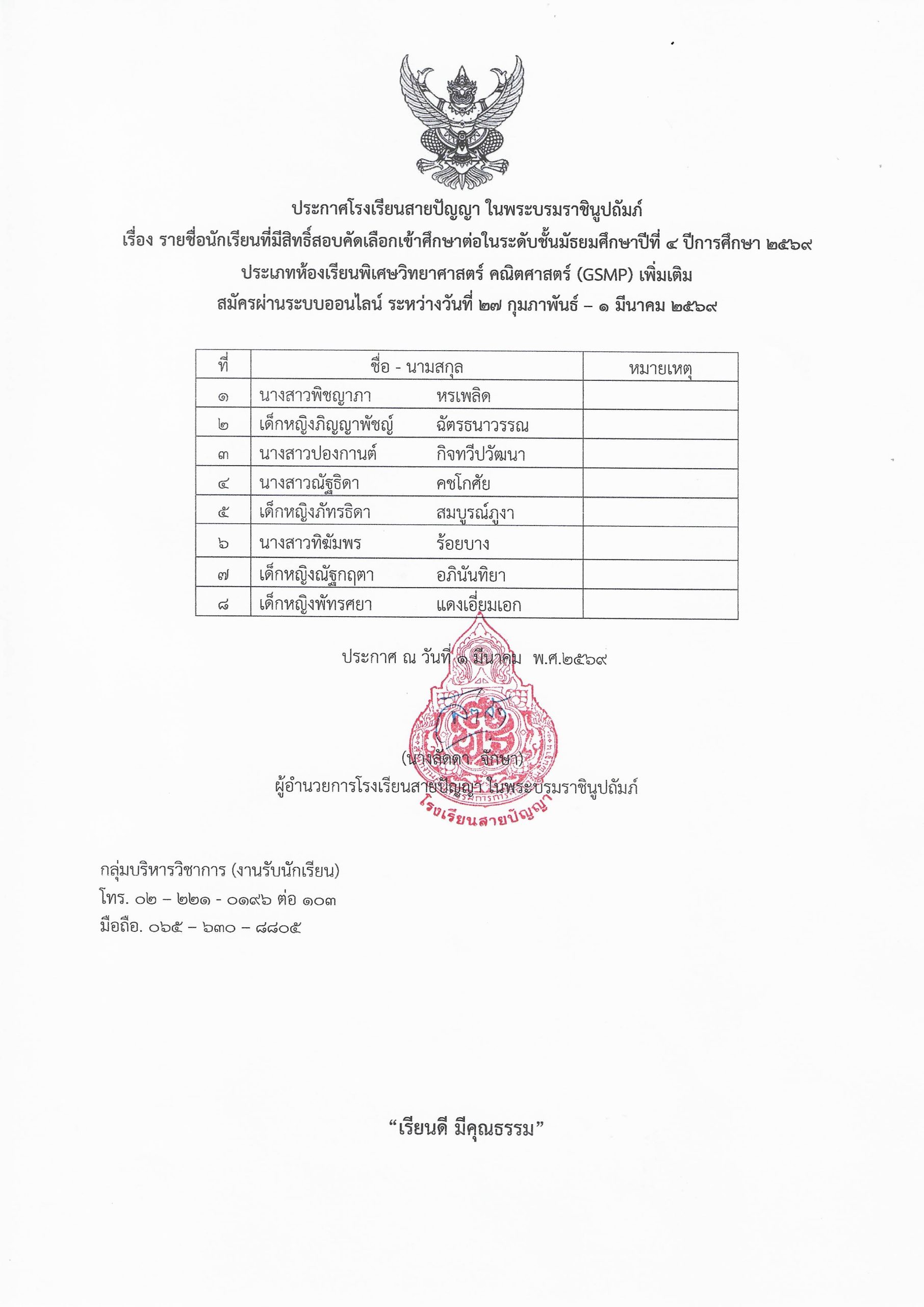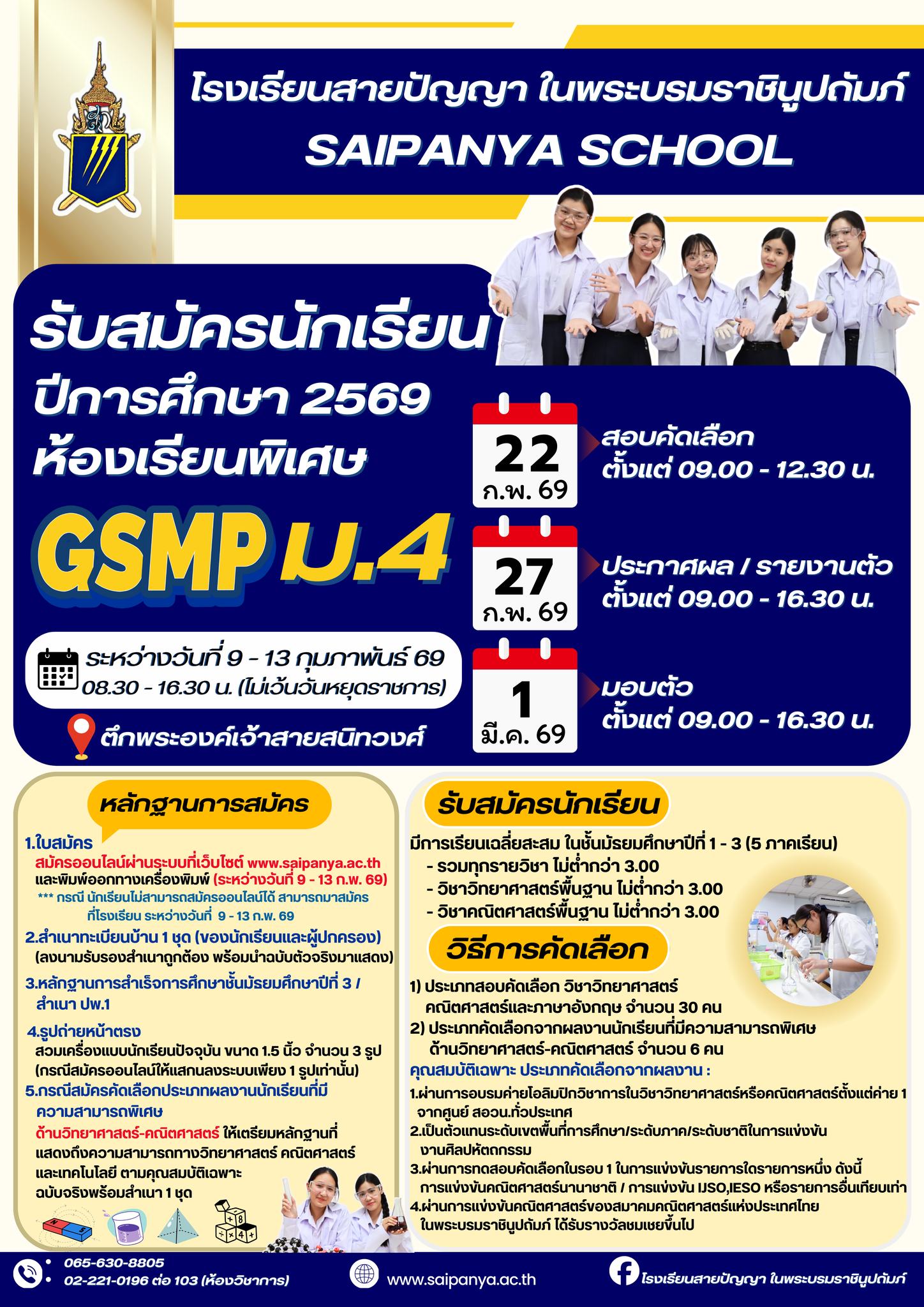 หน้าแรก ประกาศรายชื่อนักเรียนที่มีสิทธิ์สอบคัดเลือกเข้าศึกษาต่อในระดับชั้น ม.1 และ ม.4 ประเภทห้องเรียนพิเศษวิทยาศาสตร์ คณิตศาสตร์ (GSMP) เพิ่มเติม – รายนักเรียนที่มีสิทธิ์สอบคัดเลือกเข้าศึกษาต่อในระดับชั้นมัธยมศึกษาปีที่ 1 ปีการศึกษา 2569 ประเภทห้องเรียนพิเศษวิทยาศาสตร์ คณิตศาสตร์ (GSMP) เพิ่มเติม– รายนักเรียนที่มีสิทธิ์สอบคัดเลือกเข้าศึกษาต่อในระดับชั้นมัธยมศึกษาปีที่ 4 ปีการศึกษา 2569 ประเภทห้องเรียนพิเศษวิทยาศาสตร์ คณิตศาสตร์ (GSMP) เพิ่มเติม การรับสมัครนักเรียนห้องเรียนพิเศษวิทยาศาสตร์ คณิตศาสตร์ (GSMP) ม.1 และ ม.4 ปีการศึกษา 2569 เพิ่มเติม ประกาศผลการสอบคัดเลือกเข้าศึกษาต่อประเภทห้องเรียนพิเศษวิทยาศาสตร์ คณิตศาสตร์ (GSMP) – ประกาศผลการสอบคัดเลือกนักเรียนเข้าศึกษาต่อชั้นมัธยมศึกษาปีที่ 1 ปีการศึกษา 2569 ประเภทห้องเรียนพิเศษวิทยาศาสตร์ คณิตศาสตร์ (GSMP)– ประกาศผลการสอบคัดเลือกนักเรียนเข้าศึกษาต่อชั้นมัธยมศึกษาปีที่ 4 ปีการศึกษา 2569 ประเภทห้องเรียนพิเศษวิทยาศาสตร์ คณิตศาสตร์ (GSMP) การรับนักเรียนเข้าศึกษาต่อประเภทห้องเรียนวิทยาศาสตร์ คณิตศาสตร์ (GSMP) – ประกาศรายชื่อผู้มีสิทธิ์สอบคัดเลือกเข้าศึกษาต่อระดับชั้น ม.1 และ ม.4 ประเภทห้องเรียนวิทยาศาสตร์ คณิตศาสตร์– ระบบรับสมัครนักเรียนห้องเรียนพิเศษ (GSMP) ม.1 และ ม.4– ประกาศรับนักเรียนเข้าศึกษาต่อมัธยมศึกษาปีที่ 1 ประเภทห้องเรียนวิทยาศาสตร์ คณิตศาสตร์ (GSMP)– ประกาศรับนักเรียนเข้าศึกษาต่อมัธยมศึกษาปีที่ 4 ประเภทห้องเรียนวิทยาศาสตร์ คณิตศาสตร์ (GSMP) ประกาศรับสมัครนักเรียนเข้าศึกษาต่อชั้นมัธยมศึกษาปีที่ 1 ปีการศึกษา 2569 ประกาศรับสมัครนักเรียนเข้าศึกษาต่อชั้นมัธยมศึกษาปีที่ 4 ปีการศึกษา 2569 ประกาศรายชื่อผู้มีสิทธิ์สอบคัดเลือกเข้าศึกษาต่อระดับชั้น ม.1 และ ม.4 ประเภทห้องเรียนวิทยาศาสตร์ คณิตศาสตร์ ระบบรับสมัครนักเรียนปีการศึกษา 2569 ประกาศรับสมัครร้านค้าจำหน่ายอาหารในโรงเรียน กิจกรรมภายในวังเจ้าสาย ข่าวรับสมัครงาน 8 มกราคม 2024 ประกาศรับสมัครลูกจ้างชั่วคราว ตำแหน่งครูอัตราจ้าง ประกาศแจ้งจากโรงเรียน ประกาศรับสมัครนักเรียนเข้าศึกษาต่อ20 กุมภาพันธ์ 2025 ข่าวจัดซื้อจัดจ้าง ประกาศรับสมัครร้านค้าจำหน่ายอาหารโรงรียน28 กุมภาพันธ์ 2025ข่าวจัดซื้อจัดจ้าง ปฏิทินปฏิบัตงานโรงเรียน การเปิดเผยข้อมูลสาธารณะ ITA โรงเรียนสายปัญญา ในพระบรมราชินูปถัมภ์ กิจกรรมของโครงการห้องเรียนพิเศษ ความภาคภูมิใจของโรงเรียนสายปัญญา ในพระบรมราชินูปถัมภ์ แนะนำโรงเรียนสายปัญญา ในพระบรมราชินูปถัมภ์ โรงพยาบาลศิริราช ปิยมหาราชการุณย์ ไ